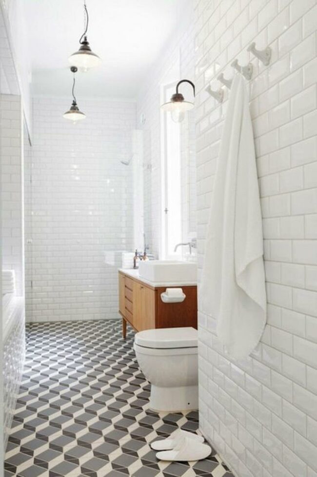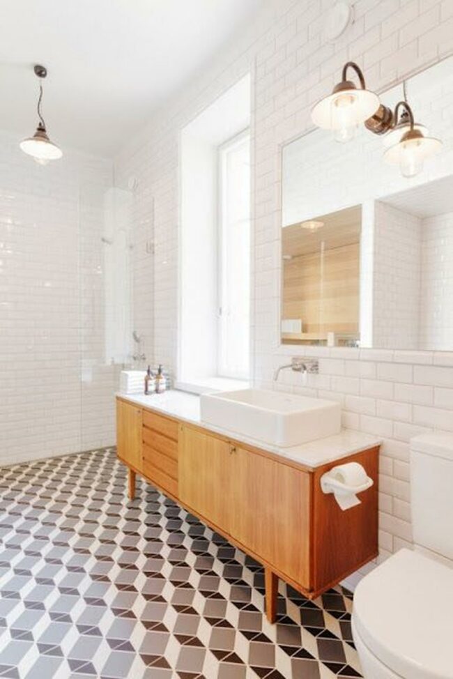 Small details like these thoughtful light fixtures and patterned floor make this bathroom both functional and visually interesting without trying too hard.