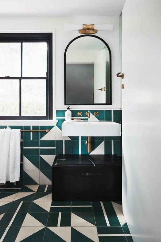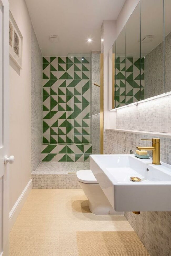 Bold geometric patterns in cool green and white tiles immediately draw attention in this bathroom, creating a modern look that feels fresh.