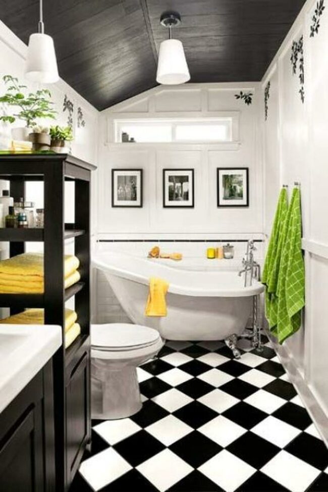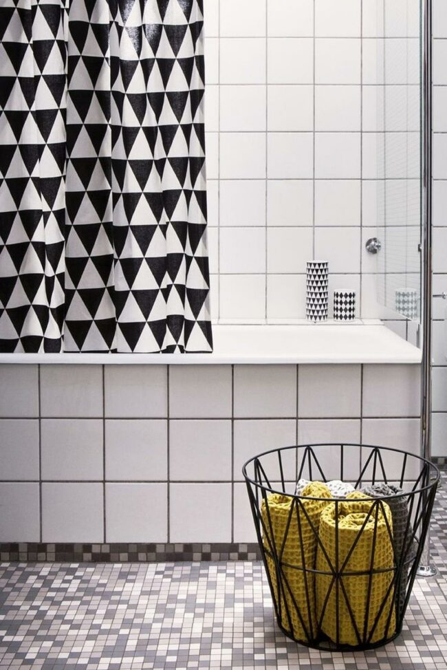 The striking black and white triangle shower curtain becomes a natural focal point that draws your attention immediately.