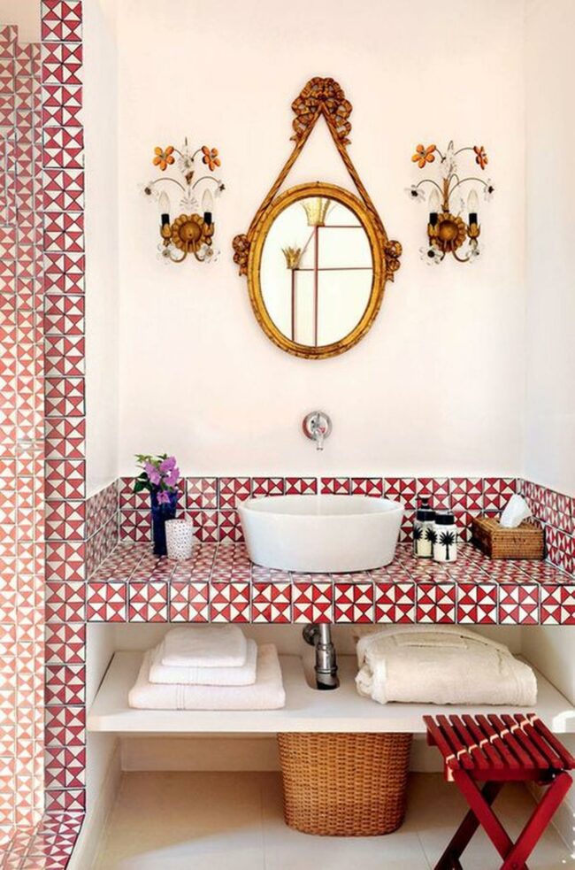 Red and white patterned tiles create a joyful atmosphere throughout this bathroom's countertop and partial wall design.