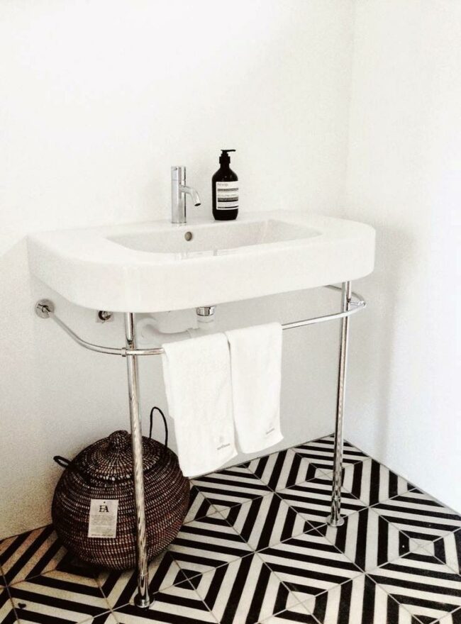 Metal legs support the sink with a modern shine that matches perfectly with the eye-catching black and white geometric floor tiles.