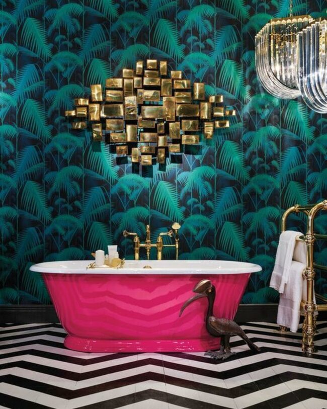 Pink stands out as the star in this bathroom with its eye-catching bathtub against leafy patterned dark green walls.