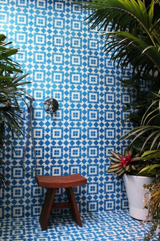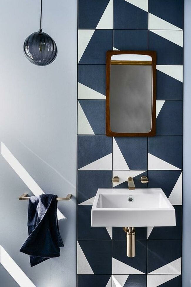 Cool geometric patterns of blue, gray, and white tiles draw attention to one wall, making it the room's focal point.