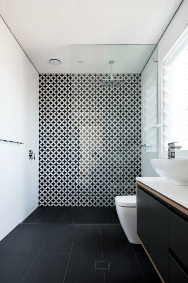 Black-and-white patterned tiles make the shower area pop with personality while adding a fun twist to the space.