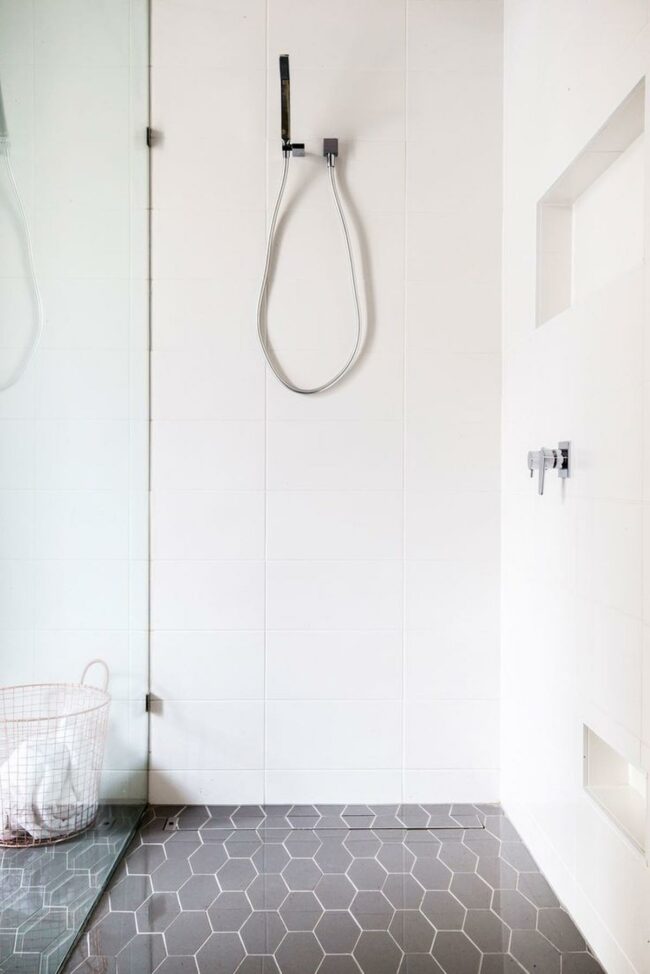 Clear glass shower doors with matching hardware showcase the white hexagonal tiles inside, making the space feel larger than it actually is.