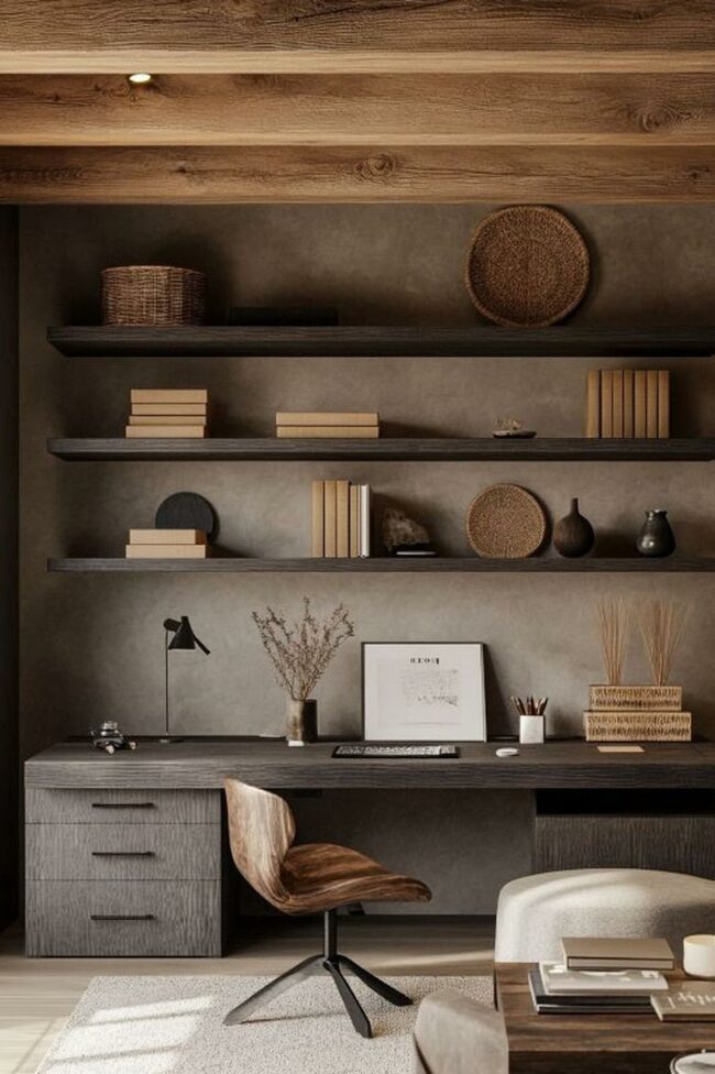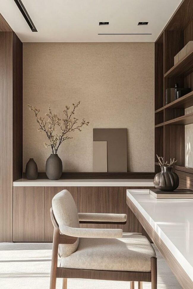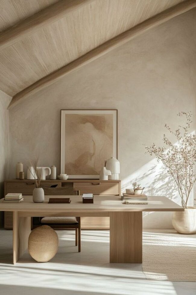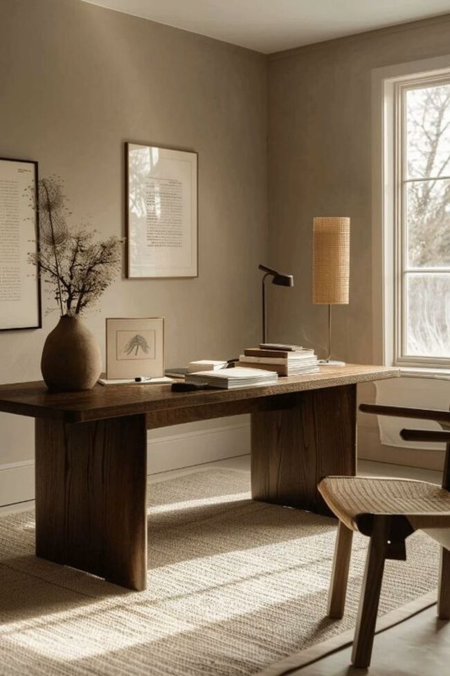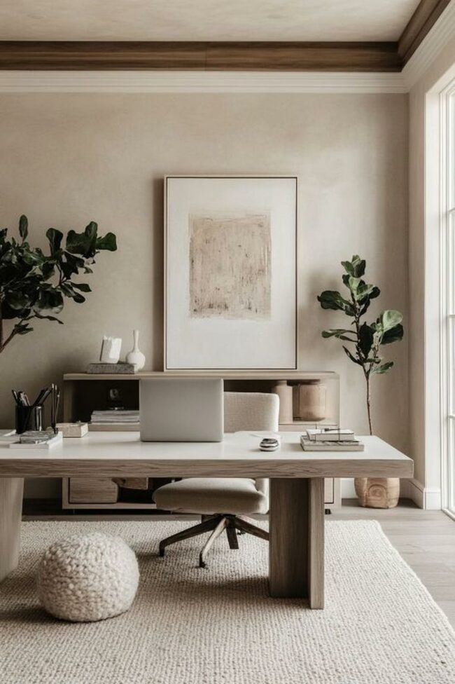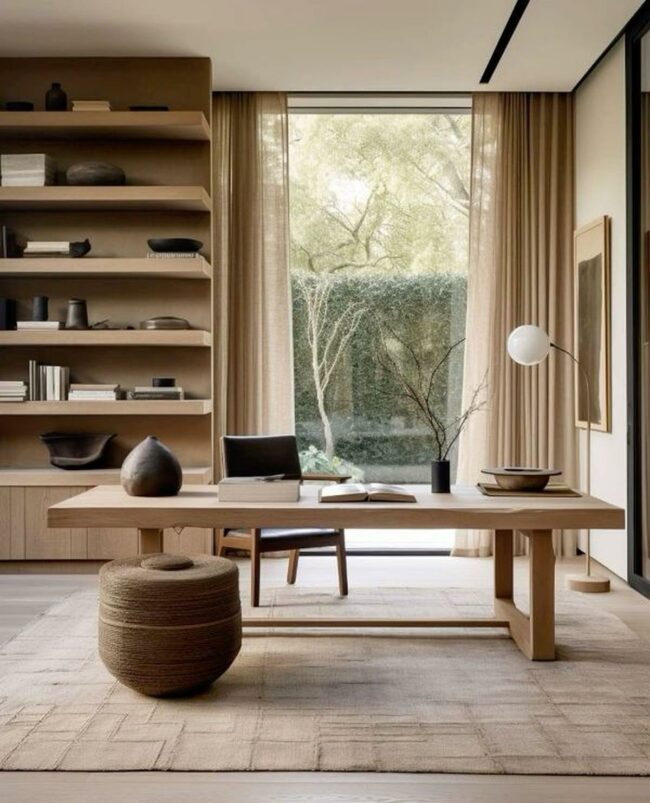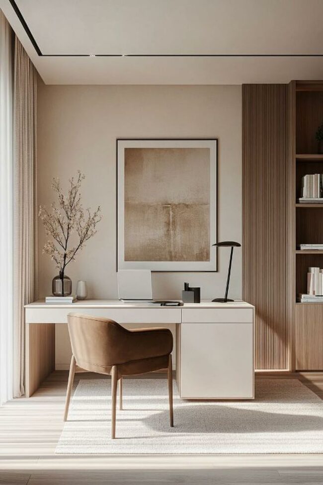 Neutral color palettes blend seamlessly, making this room a perfect sanctuary for focused thinking.