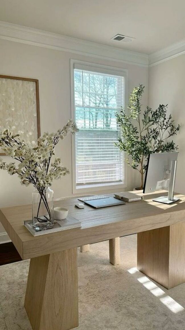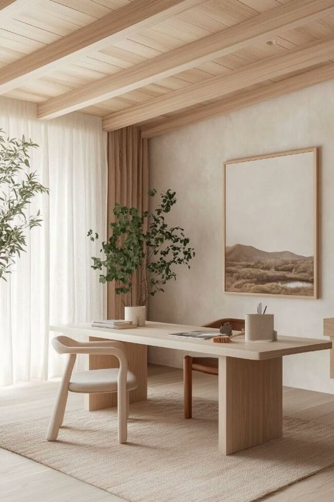 Natural wood tones and neutral colors create a peaceful workspace atmosphere.