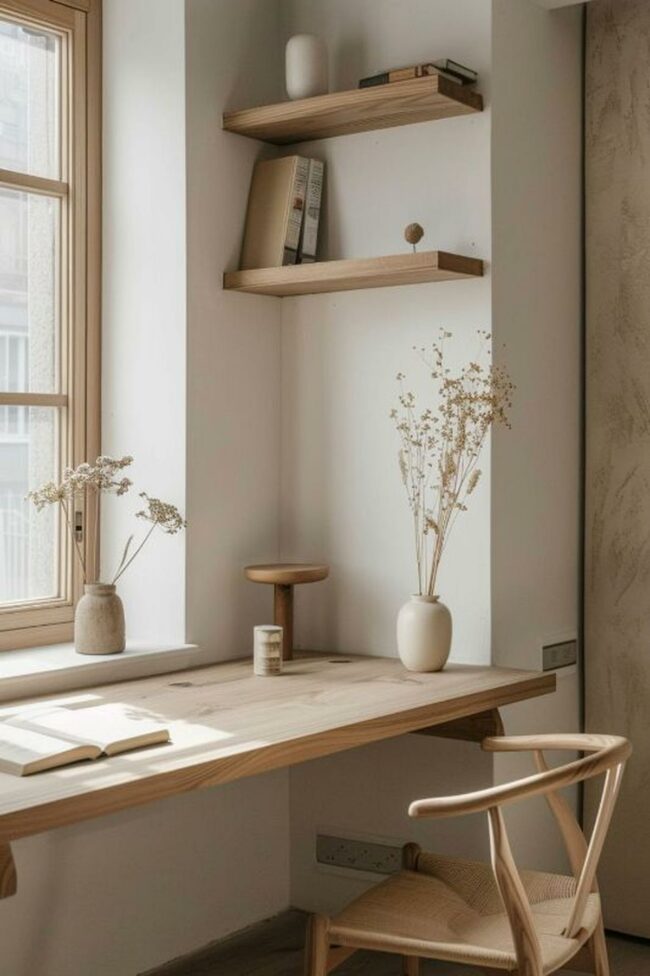 Wooden desk surfaces display curated items like carefully arranged books and a striking black vase, adding personality to the space.