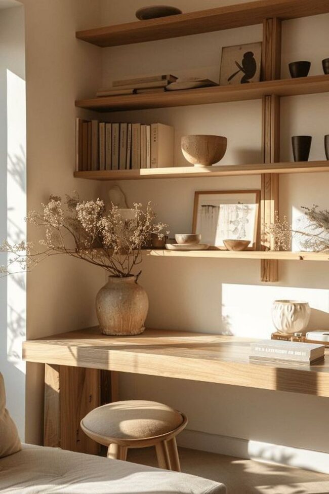 Wooden shelves and cabinets create a warm, natural atmosphere in this serene space.