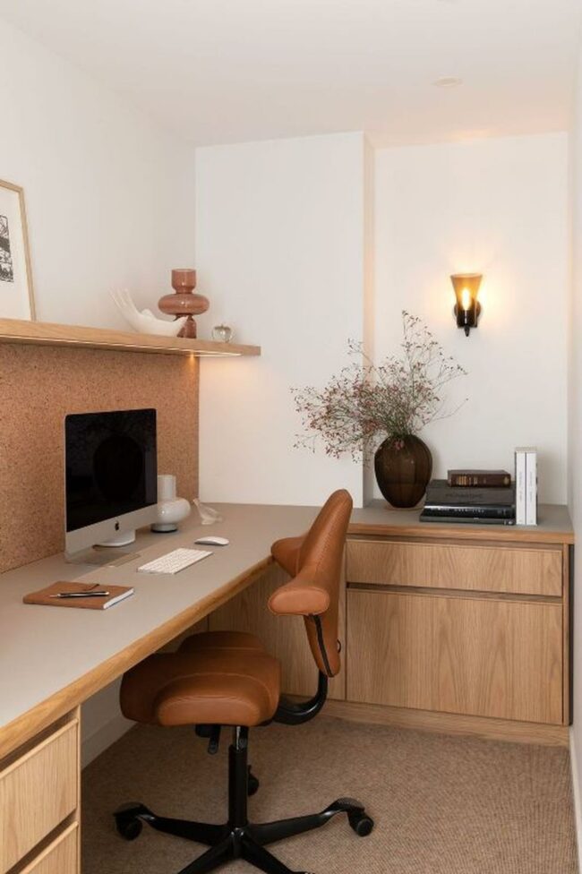 Clean lines and natural materials complete this harmonious workspace that balances aesthetic appeal with functional efficiency.