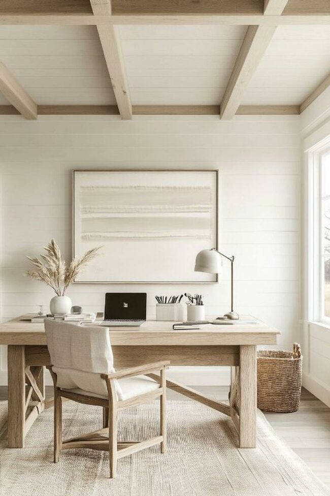 Pale wood furniture blends seamlessly with light-colored walls, creating a serene workspace environment.