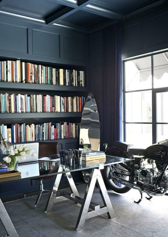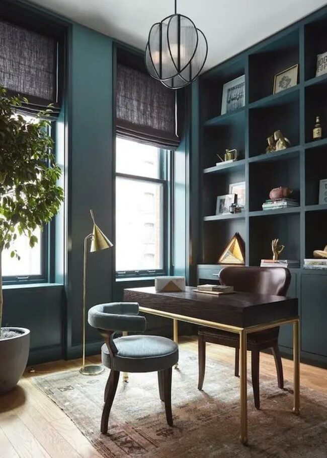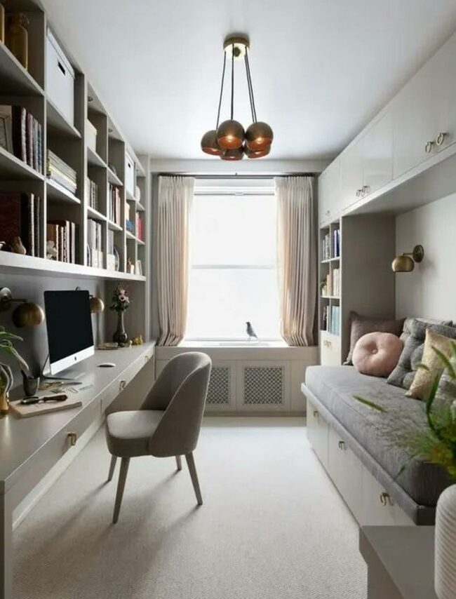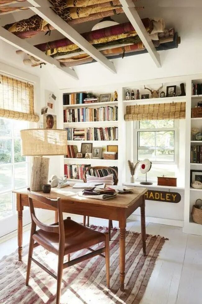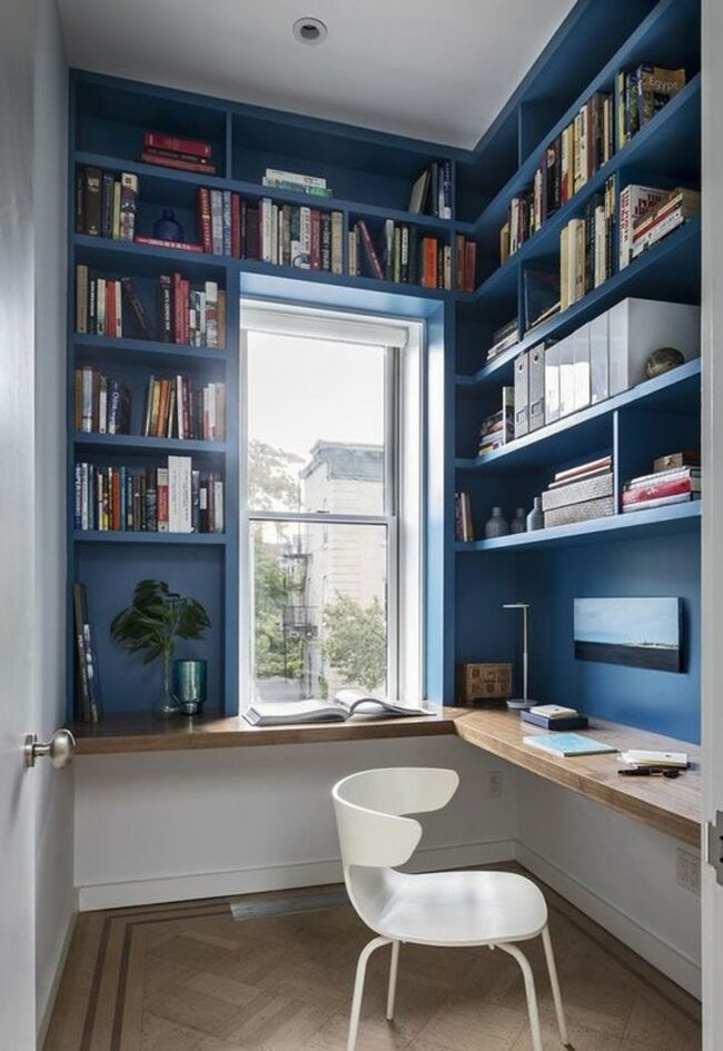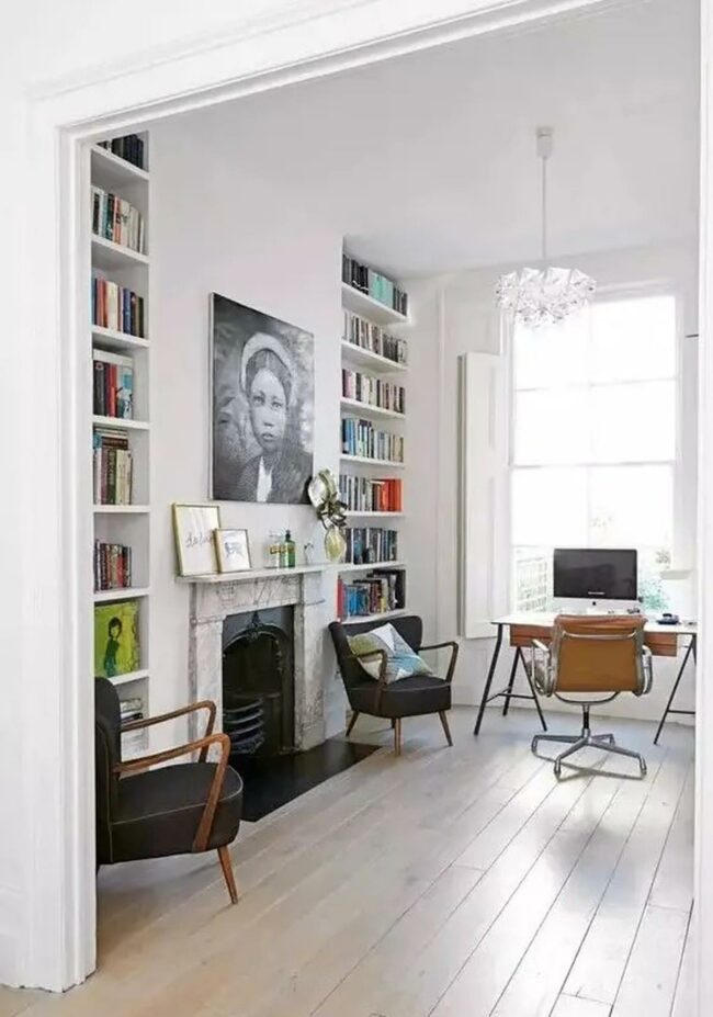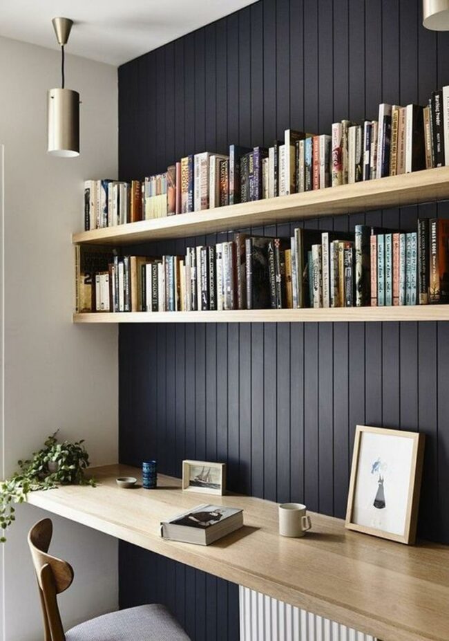 Books, plants, and minimal decorations line the walls, creating an inspiring atmosphere without overwhelming the space.