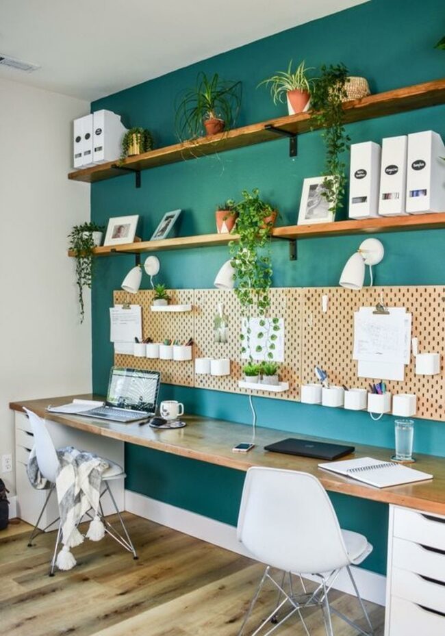 Small plants and decorative items sit neatly on floating white shelves, bringing life to the workspace without causing clutter.