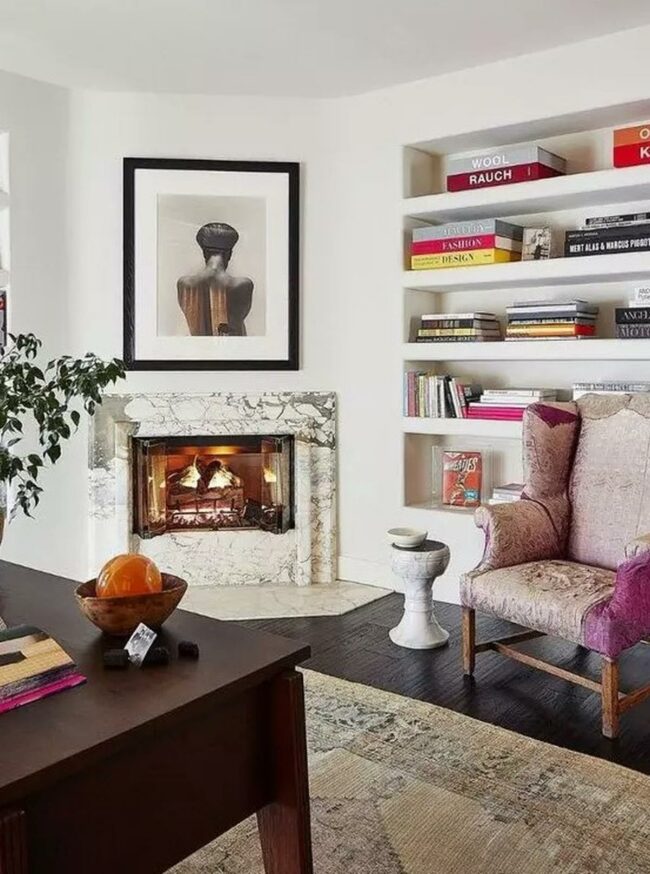 Countless books line the tall shelves flanking a simple fireplace, providing both knowledge and visual interest.
