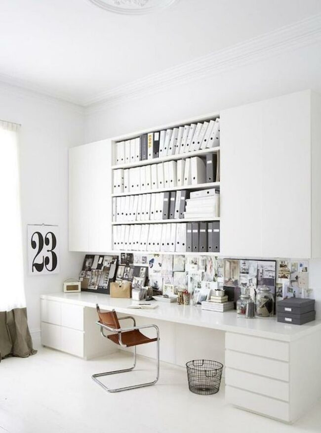 White binders line the shelves above in perfect order, making organization seem almost effortless in this space.