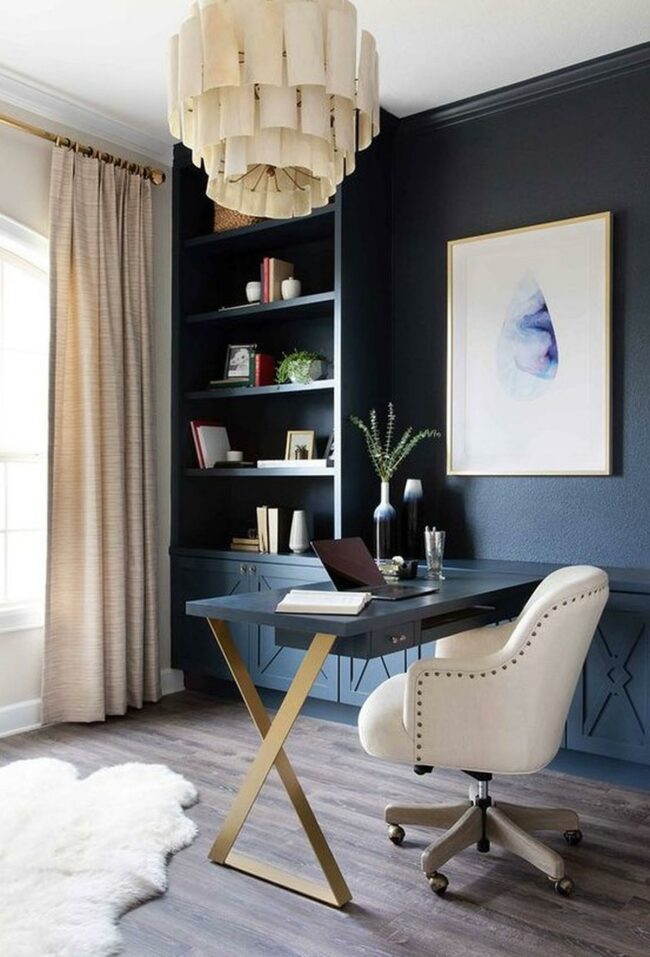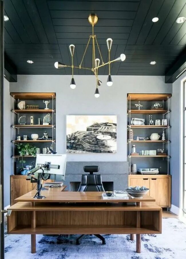 The modern chandelier serves as an eye-catching focal point while providing ideal lighting for late-night work sessions.