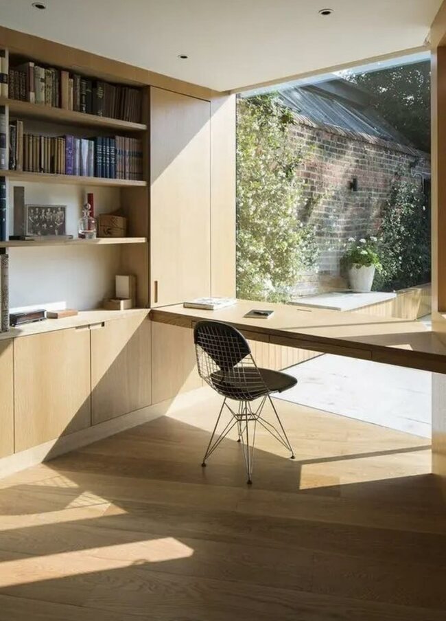 The desk positioned by the window serves as an ideal workstation where concentration comes easily with the outdoor view.