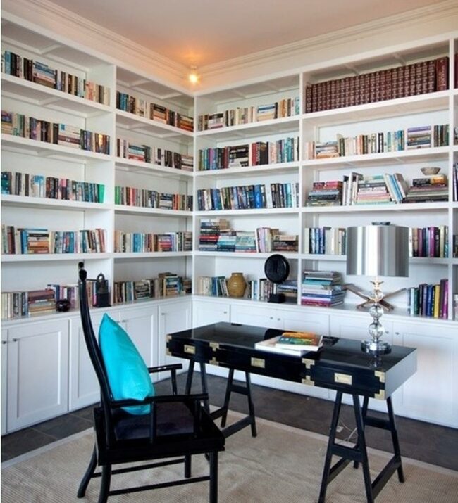Bookshelves towering behind the desk showcase an impressive collection alongside tasteful decorations that reflect personal style.