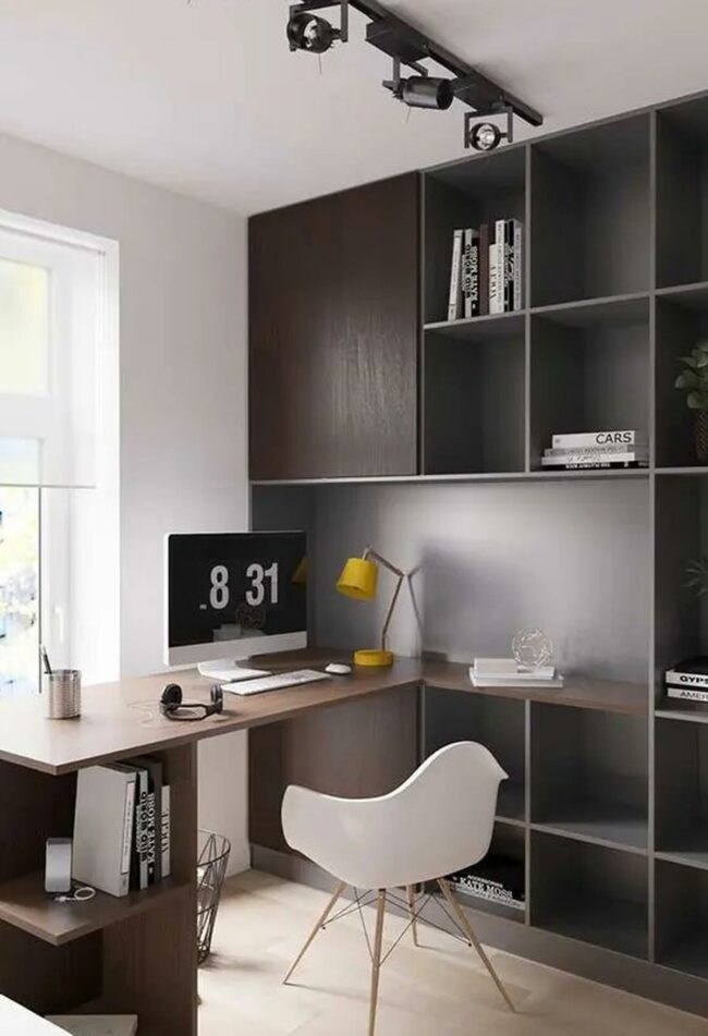 Modern shelving in rich dark wood creates an inviting workspace that feels both tidy and sophisticated.