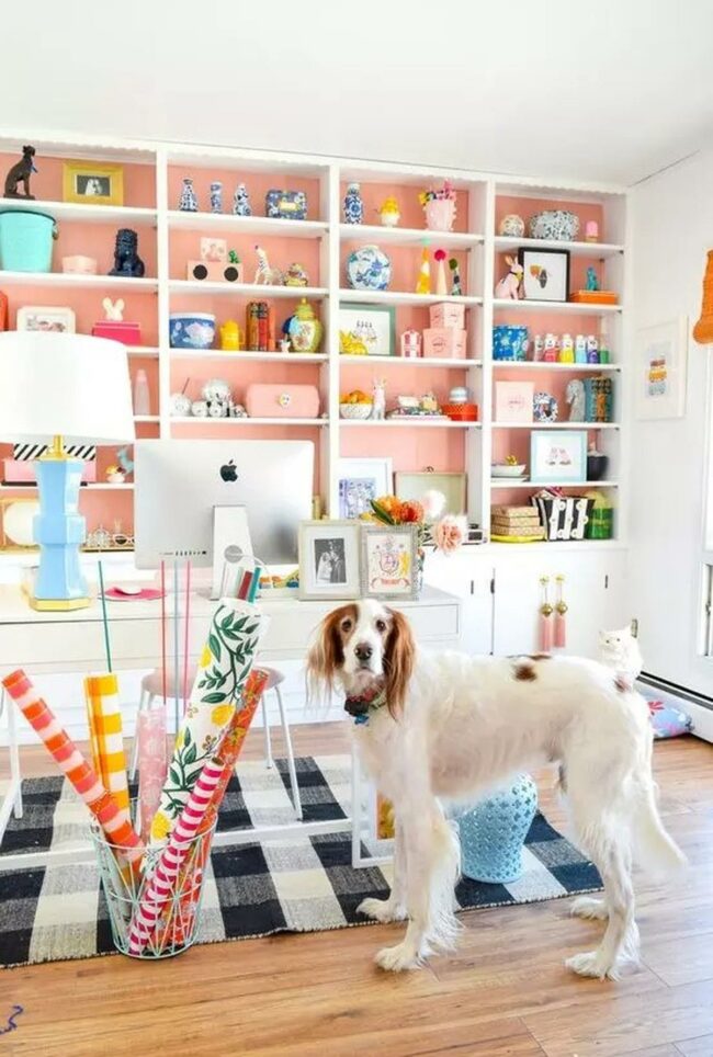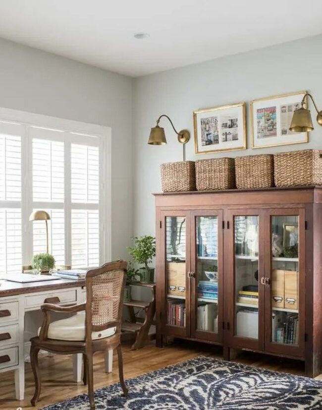 Books, baskets, and carefully chosen decorative items line wall shelves, telling stories about the person who works here.