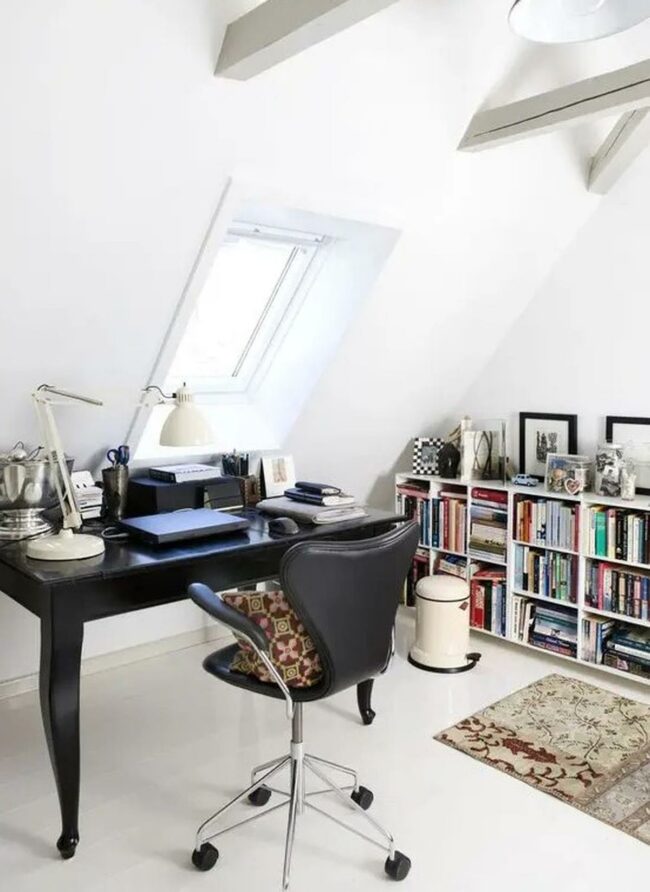 Natural light streams through the slanted window, creating a fresh atmosphere in this white-walled office space where a black desk serves as the room's focal point.