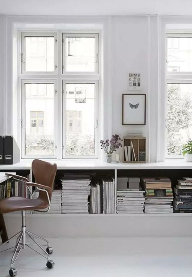 The brown rolling chair brings warmth to the room while matching the wooden shelves that run beneath the windows.
