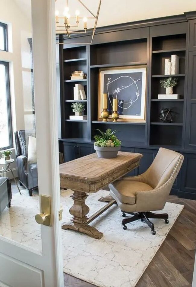 Modern design meets comfort in this inviting home office where dark built-in shelves contrast beautifully with the natural wood desk.