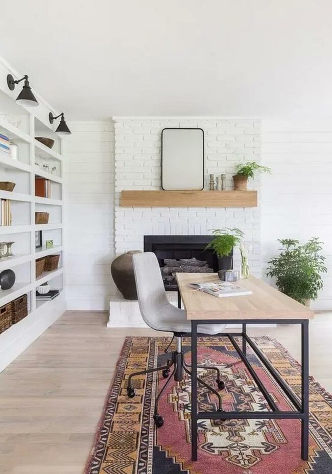 Natural light dances across this inviting office space, where a crisp white brick fireplace serves as the room's striking centerpiece.