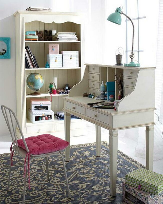 The white desk with compact drawers keeps art supplies organized and within reach for your creative moments.