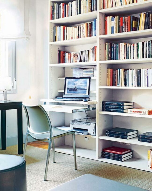 Modern white shelves lined with black and white binders create a tidy workspace in this compact office corner.