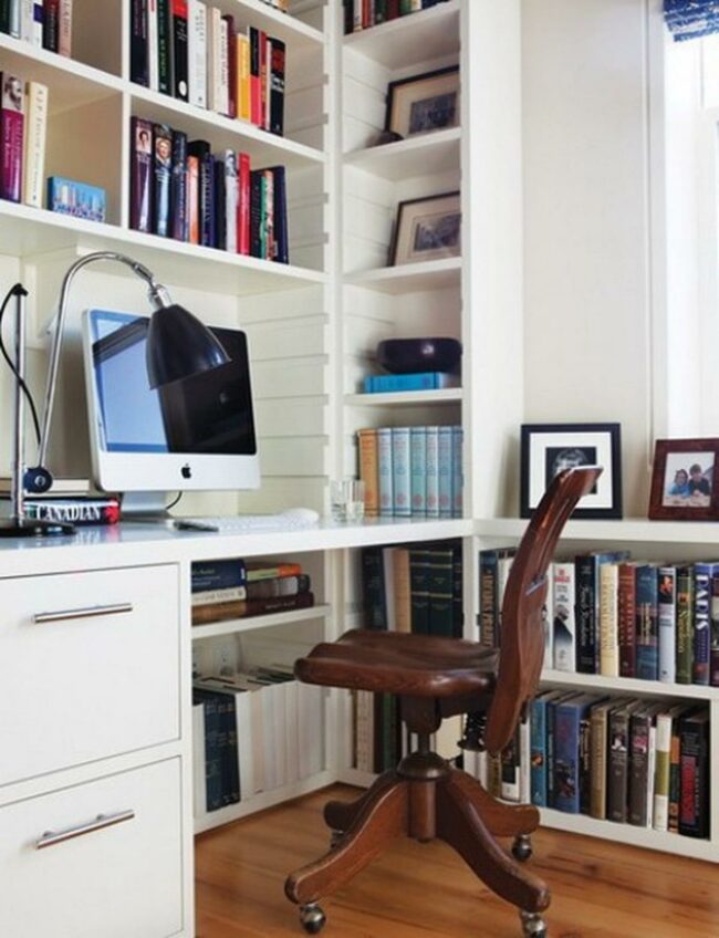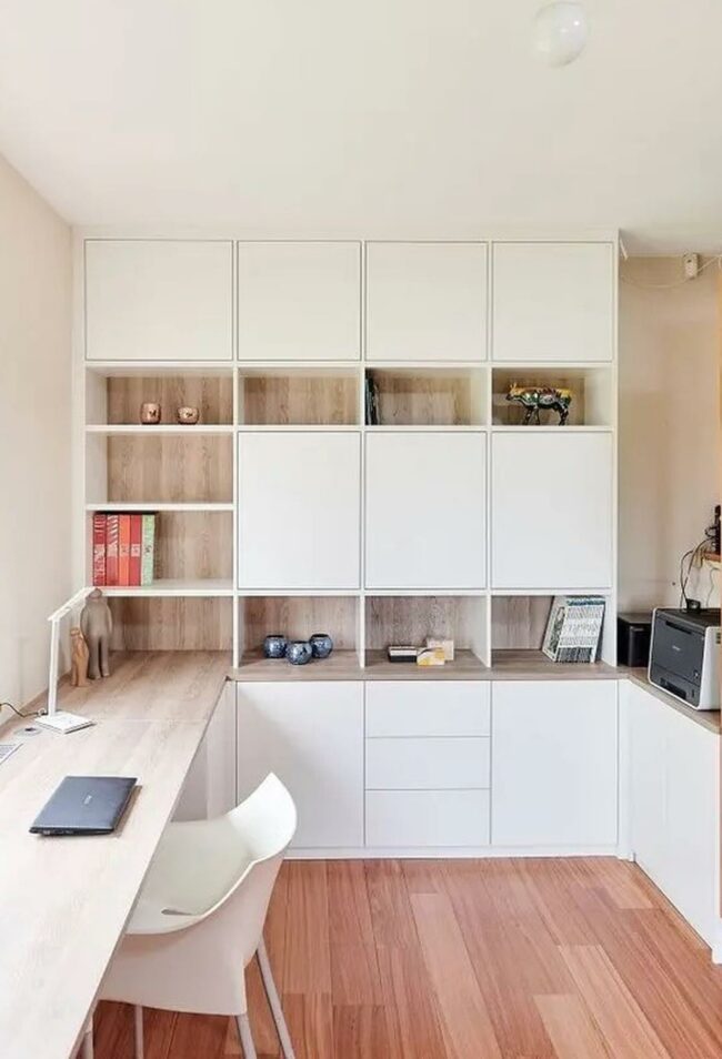 The wooden desk and floors add a warm touch that balances the crisp white storage solutions throughout the space.