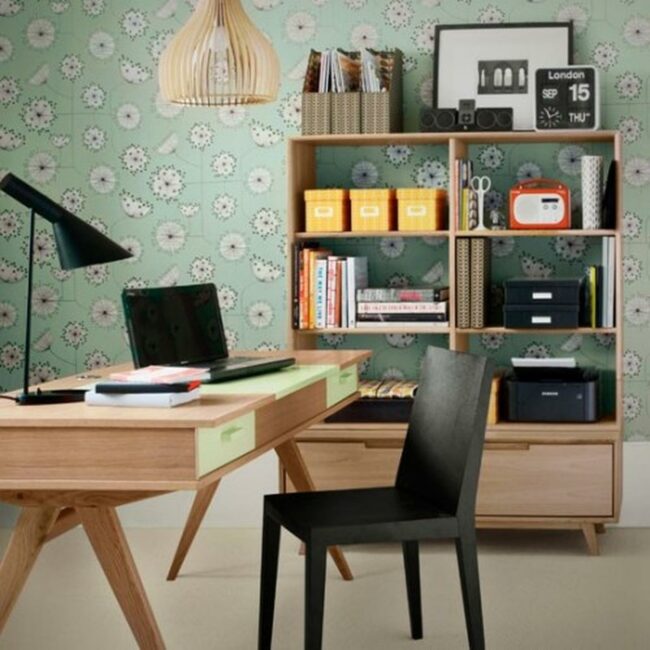 The mint green desk lamp provides focused illumination when daylight fades and evening work continues.