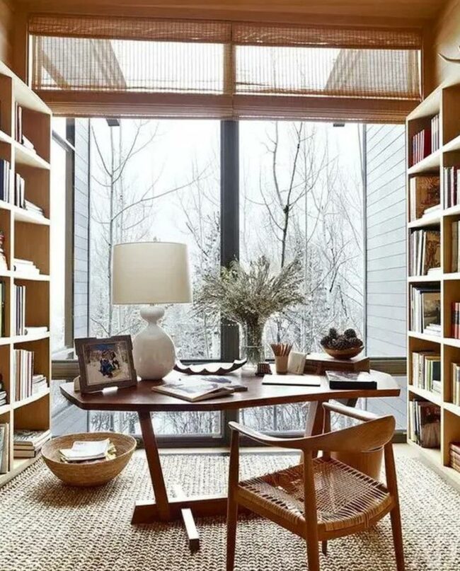 Everything sits in perfect balance, from the desk positioning to the thoughtful shelf arrangements.