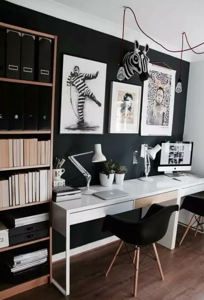 Rolling chairs offer comfortable seating at the workstation, while black metal shelves with wooden drawers provide both storage and display space for books and decorations.