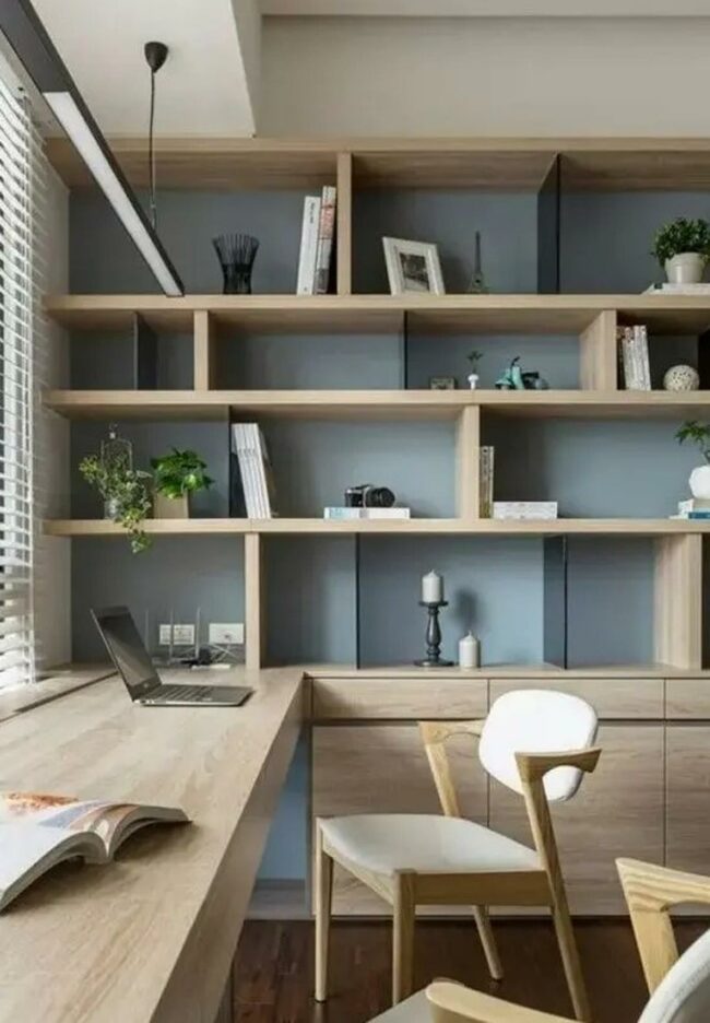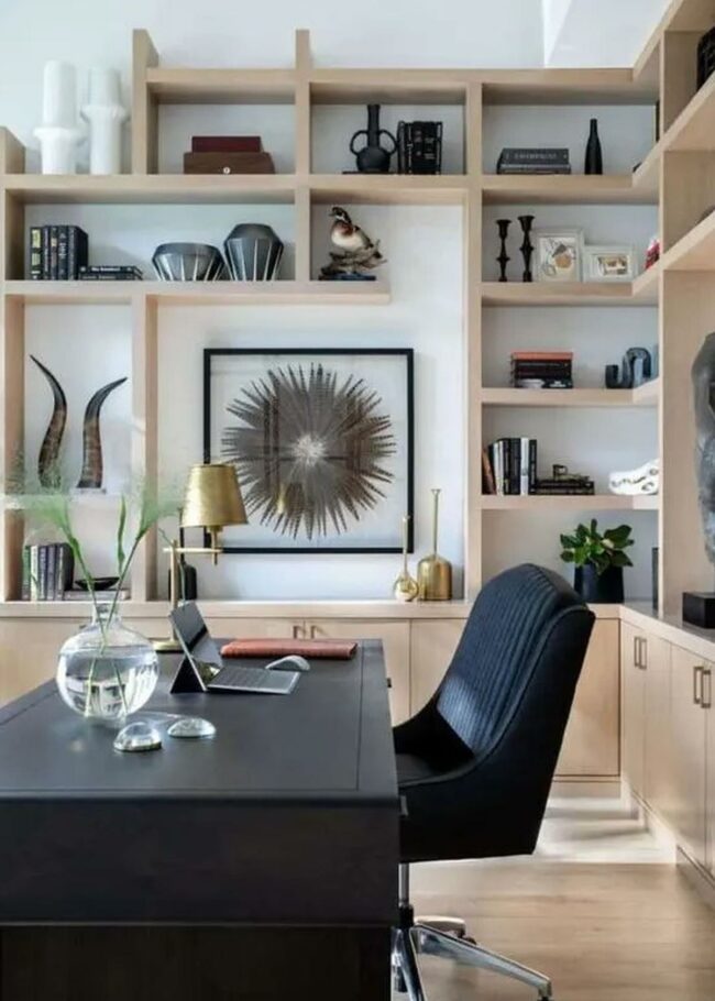 Modern wooden shelves stocked with books and decorations create a tidy, smart look throughout this office space.