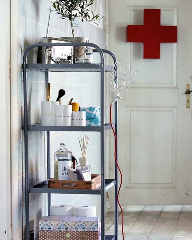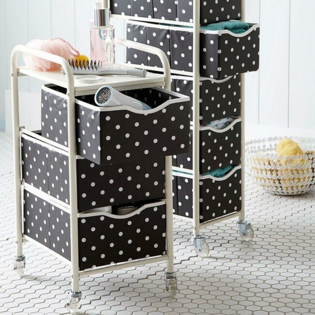 Beauty products and a hairbrush sit neatly atop one cart, ready for quick access.