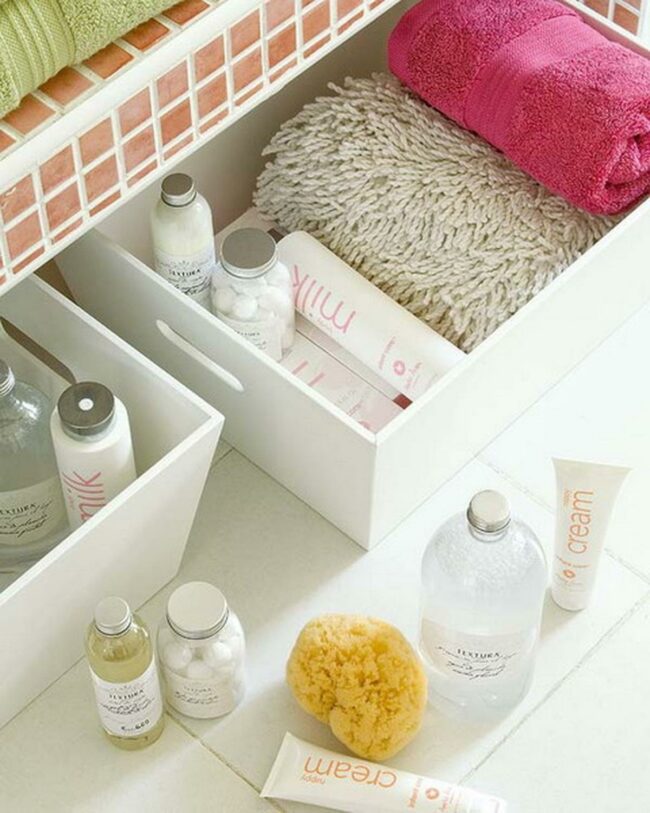 Four open drawers showcase meticulously organized baskets brimming with essential toiletries and fluffy towels.