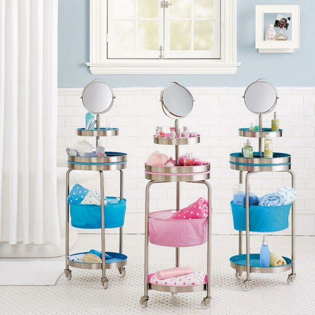 Three metal rolling carts showcase colorful pink and blue baskets brimming with neatly folded towels and essential bath items.