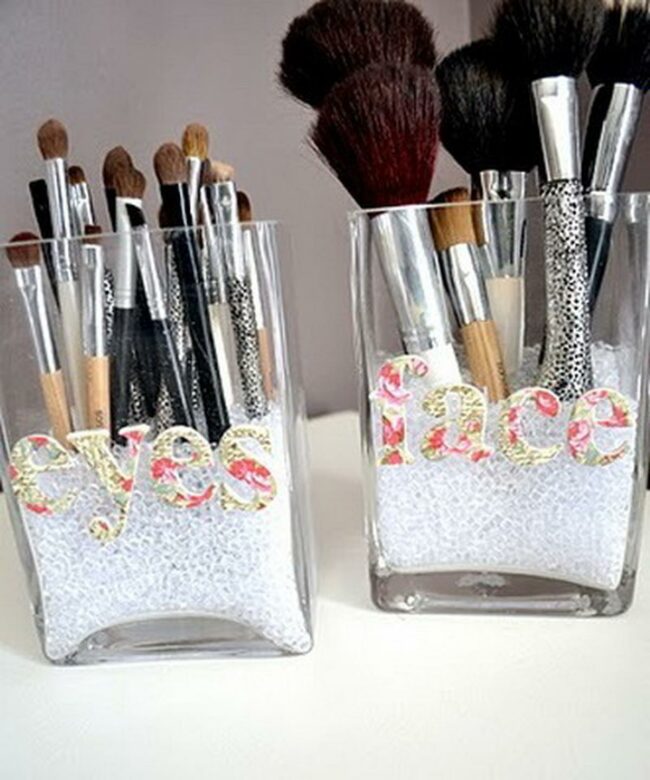 Different brush sizes nestle comfortably inside clear glass, showing thoughtful organization.