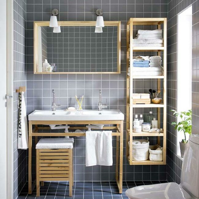 Warm wooden shelves elevate this bathroom's design, creating an inviting sanctuary with clean white tiles and a small square pattern.