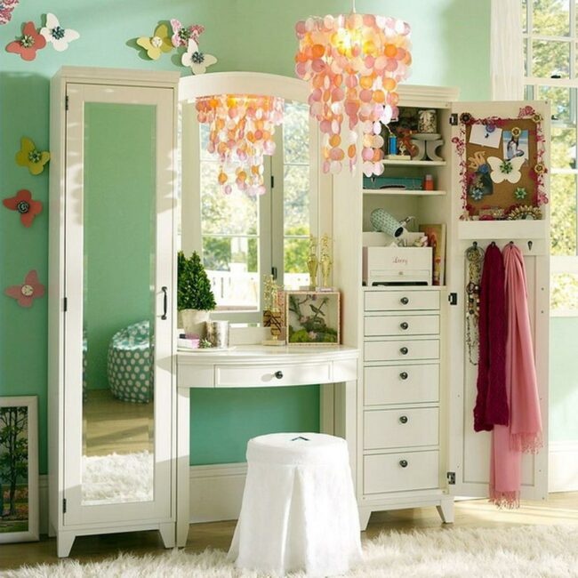 Vanity table features smooth drawers and a fluffy white stool that beckons relaxation.