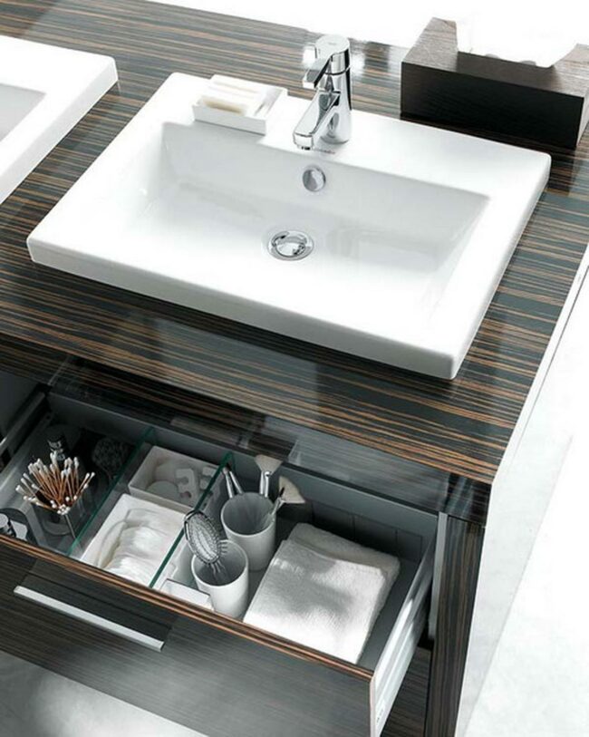 Beige towels rest softly at the back, adding warmth and texture to the drawer's elegant layout.