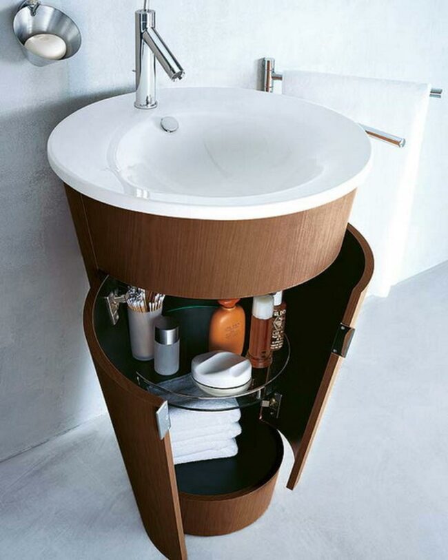 Streamlined design maximizes functionality in a compact bathroom or bedroom area.