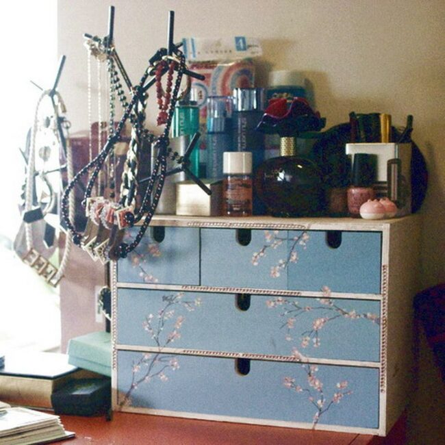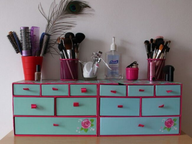 Blue drawers with pink edges and red handles showcase a delightful beauty station that catches your eye instantly.