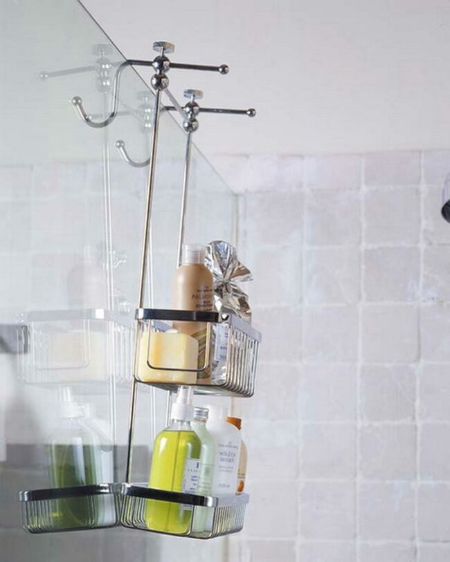 Shiny silver hooks gleam against clear glass, drawing attention to a metal shower caddy.