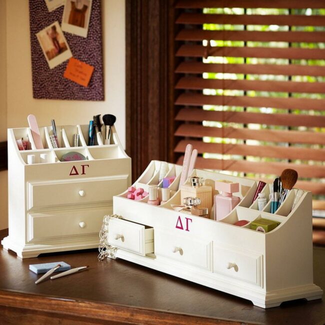 Makeup brushes, nail files, and beauty products nestle perfectly inside small drawers and compartments.