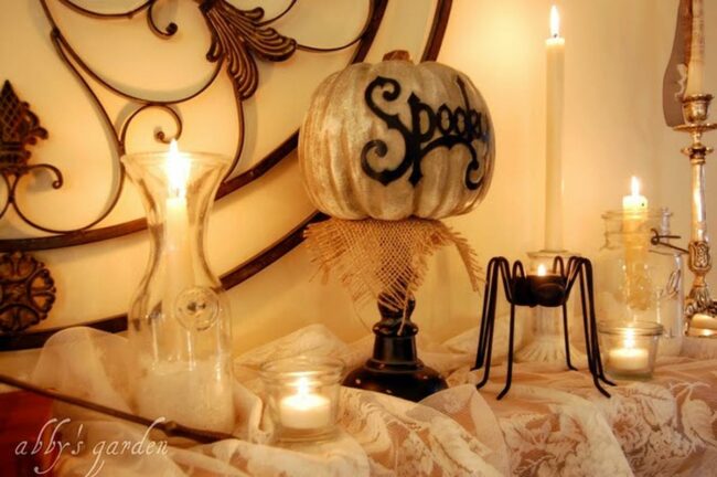 Candlelight dances across this charming corner, where a playful pumpkin painted with "Spooky" serves as the eye-catching centerpiece.