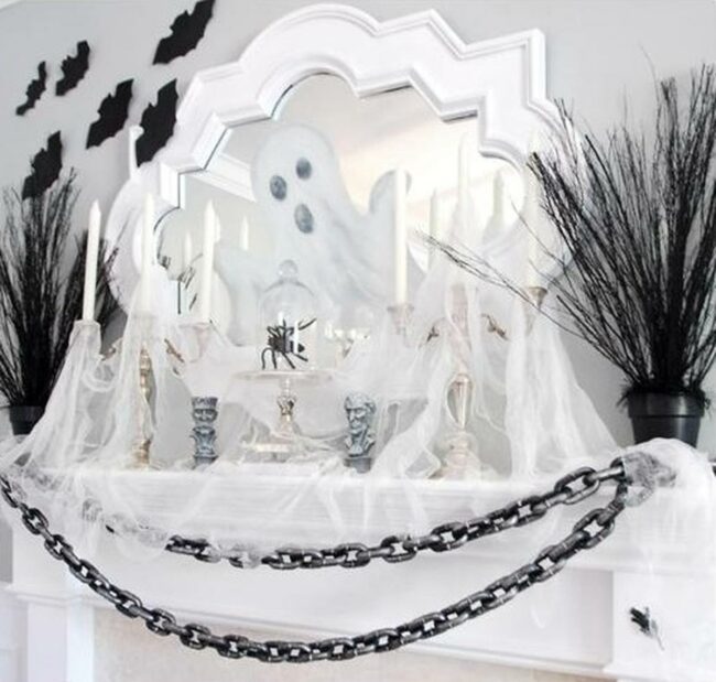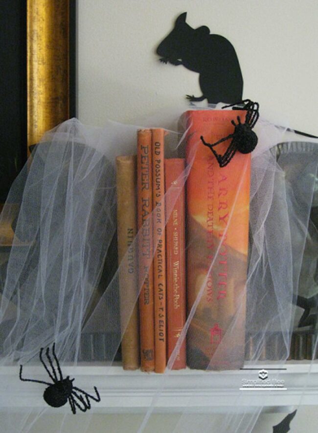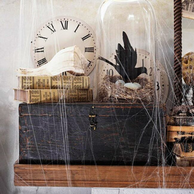 Delicate spider web-like fabric drapes gracefully across the mantel, creating just enough spooky atmosphere to spark interest.