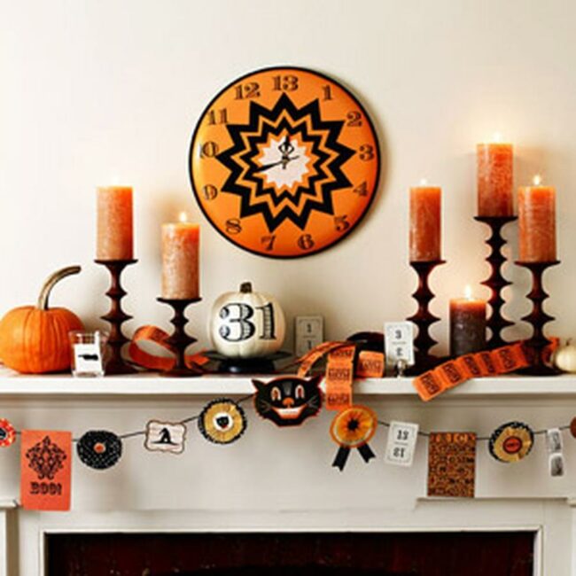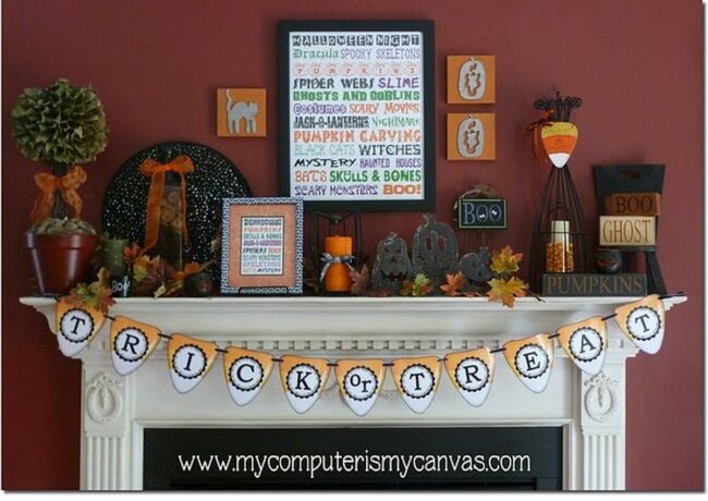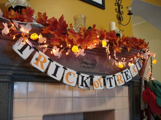 Halloween decorations adorn the mantel with a festive banner nestled among small pumpkins and playful figures that capture the fall spirit perfectly.
