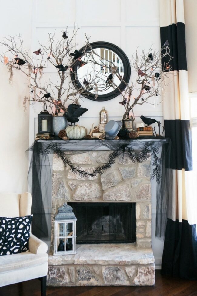 Spooky black branches and delicate spiderwebs stretch across the mantel, creating that perfect haunted house feel without going overboard.